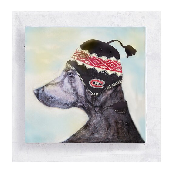 Whimsical Dog Art - Weimaraner with Montreal Canadien Arctic Sherpa Hat Canvas Print on 5x5 Art Block - Go Habs Go - Kids Playroom Decor by PeyLu